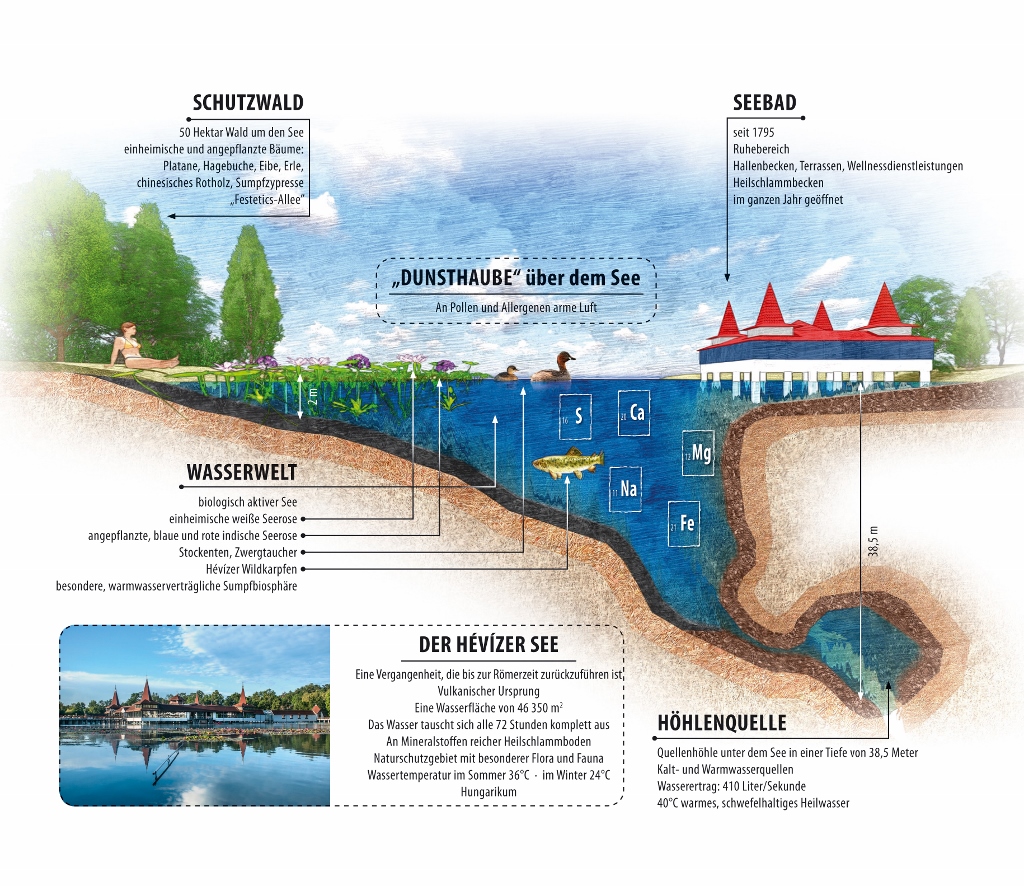 Lecznicze jezioro termalne Hévíz, o powierzchni około 5 hektarów, nazywa się „najpiękniejszą wanną na świecie”. To największe na świecie, biologicznie czynne jezioro lecznicze, powstałe w kraterze wulkanu, zasilane przez dwa źródła gorącej wody bijące na głębokości 38 metrów. Całkowita wymiana wody w jeziorze następuje w ciągu zaledwie 48 godzin. Jego ciepłe alkaliczne wody, o lekko podwyższonej radioaktywności, są bogate w sole potasu oraz siarkę i wodorowęglany –substancje, które łagodzą bóle stawów, zaburzenia przemiany materii i dolegliwości kobiece. Na zdrowych gości również czeka tu wiele atrakcji, choćby degustacja węgierskich win czy lot balonem.